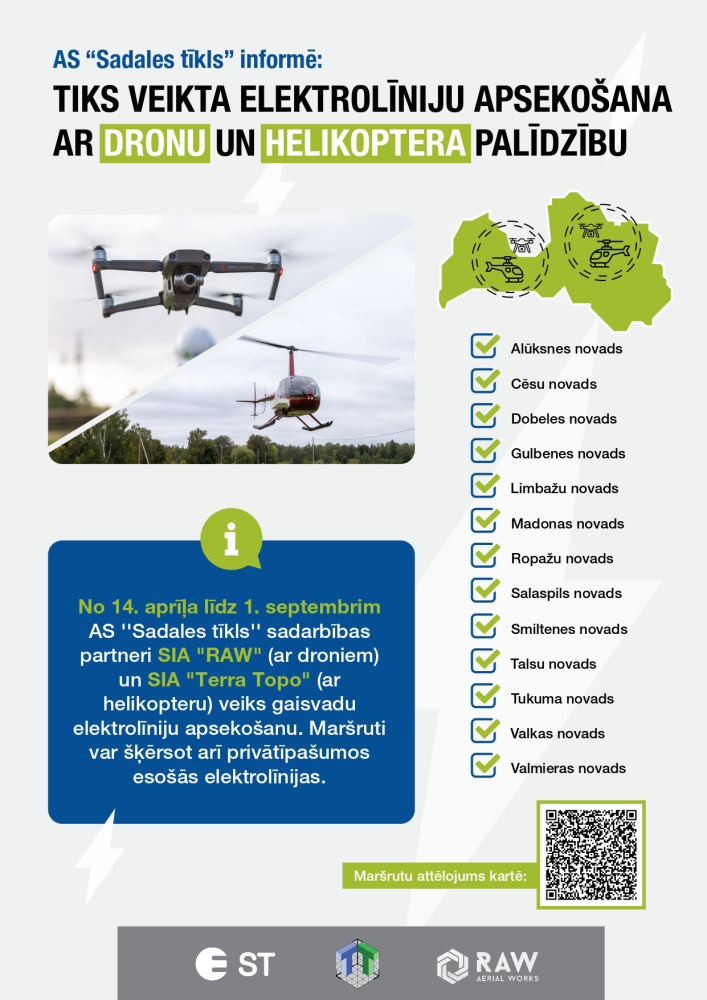 Elektroenerģijas sadales sistēmas operators AS "Sadales tīkls" sadarbībā ar pašmāju uzņēmumiem SIA "RAW" un SIA "Terra Topo" šogad realizēs ambiciozu projektu gaisvadu elektrolīniju apsekošanā ar inovatīvu tehnoloģisko risinājumu, kas ietver dronu un helikoptera izmantošanu. Kopumā plānots apsekot gaisvadu elektrolīnijas apmēram 3 100 kilometru garumā.