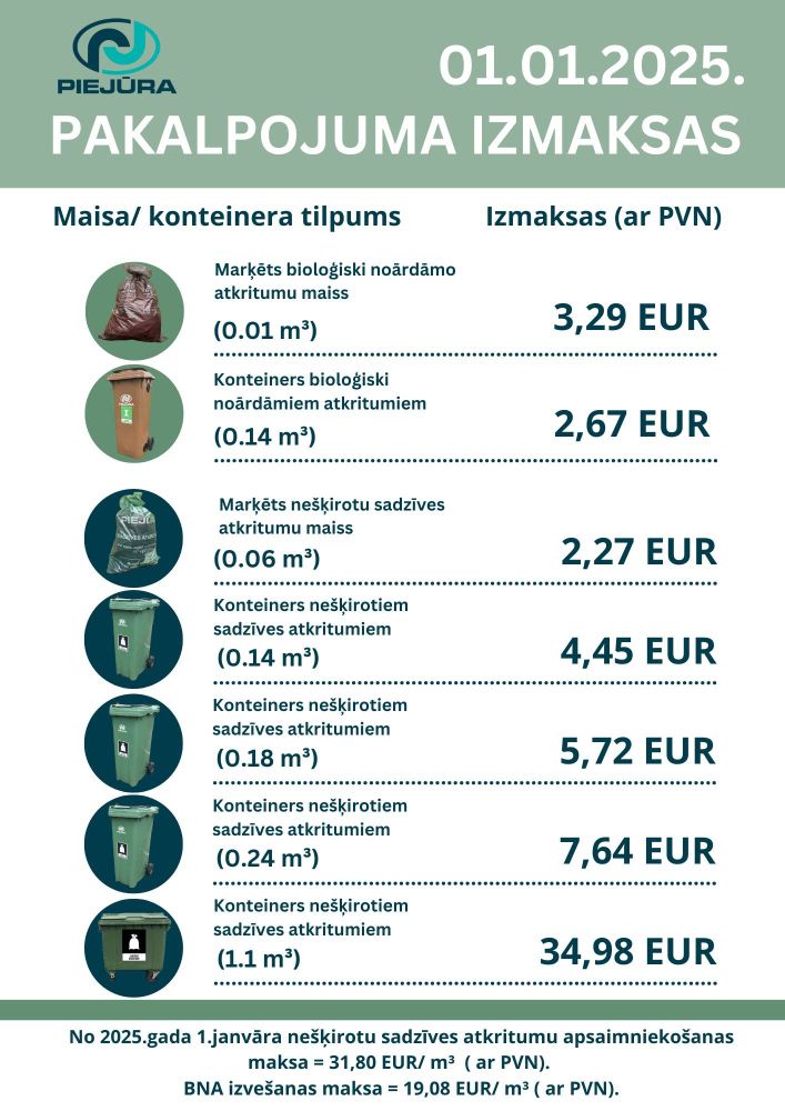 Bioloģisko atkritumu cenas: 1. Jaunā maksa: 19,08 EUR/m³ (iesk. PVN) 2. Iepriekš: 16,87 EUR/m³