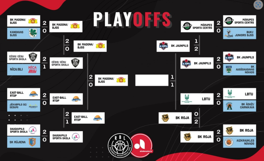 Trešo, izšķirošo maču Reģionālās basketbola līgas (RBL) izslēgšanas spēļu pusfināla sērijā aizvadījusi "Jaunpils" komanda, kas izbraukumā tikās ar BK "Roja" basketbolistiem un piedzīvoja zaudējumu ar 74:89. Līdz ar to Jaunpils no cīņas par zeltu izstājas, taču komandai būs iespēja pacīnīties par 3. vietu.