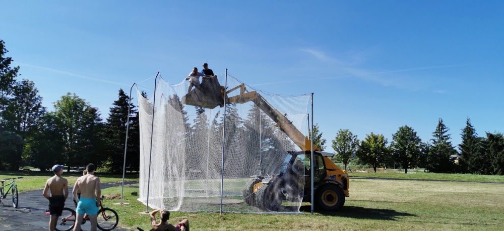 Izmantojot smago tehniku, uz stabiem tika uzvilkts sektora ierobežojošais siets. Stabi, kā arī sektora betona pamatne tika uzbūvēta jau iepriekš.