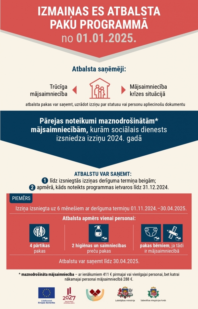 * Atbalstu turpina saņemt vistrūcīgākās personas (personas ar trūcīgās mājsaimniecības statusu un krīzes situācijā nonākušie Latvijas iedzīvotāji un Ukrainas civiliedzīvotāji), tām saglabājot visus līdzšinējos atbalsta veidus un to apmēru, tostarp pārtikas atbalstu 2 komplektus personai ceturksnī. * Maznodrošinātās mājsaimniecības, kurām sociālais dienests 2024. gadā ir izsniedzis izziņu par statusu un tās derīguma termiņš beidzas 2025. gadā, var saņemt atbalstu līdz izziņas derīguma termiņa beigām atbilstoši nosacījumiem, kādi bija spēkā līdz * * 2024.gada 31.decembrim. * Savukārt maznodrošinātām mājsaimniecībām ar izziņām, kas izsniegtas no 2025.gada 1.janvāra, vairs netiek piešķirtas tiesības uz atbalstu.
