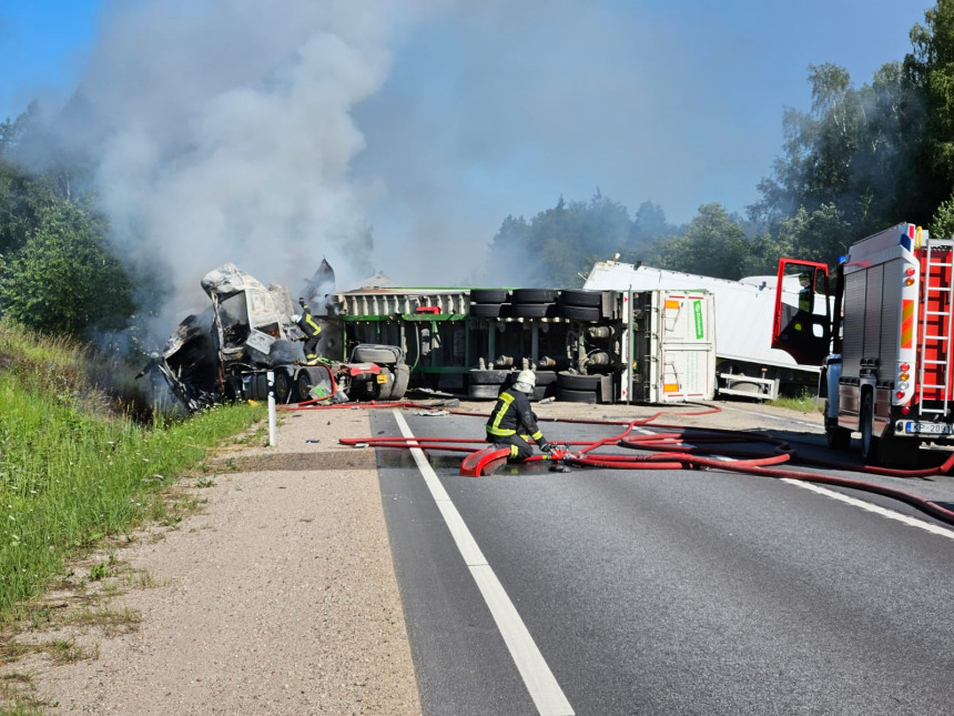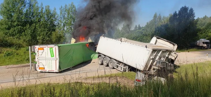 Jaunmokās trīs kravas auto avārijā viens bojāgājušais; bloķēta satiksme uz Ventspils šosejas