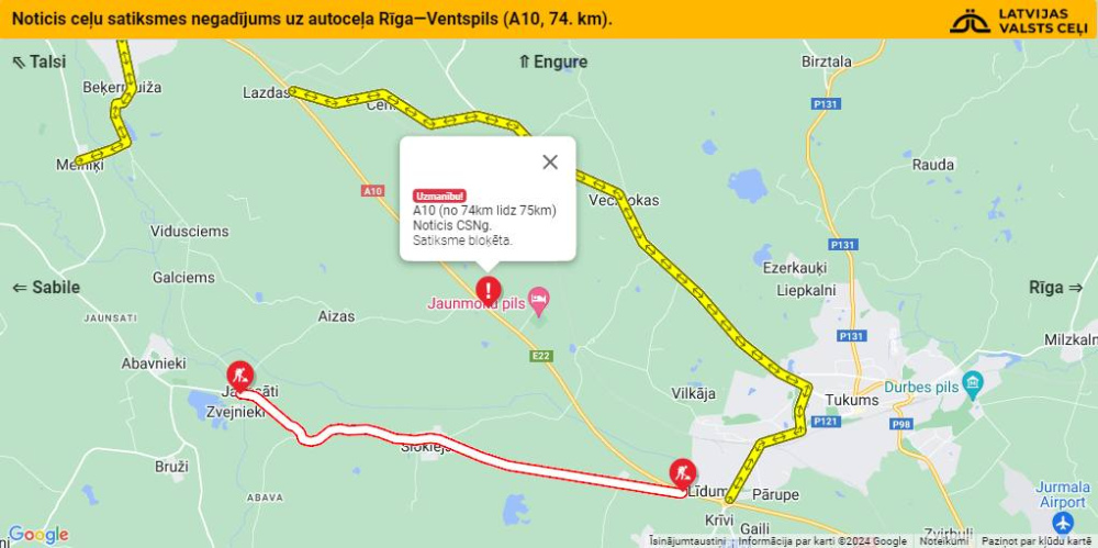 Latvijas Valsts ceļi ziņo, ka uz Ventspils šosejas (A10) netālu no Jaunmoku pils noticis ceļu satiksmes negadījums. Sadursmes rezultātā viens no kravas spēkratiem aizdedzies. Kā no likumsargiem noskaidrojis portāls TVNET, negadījumā viena persona gājusi bojā. Apbraukšana iespējama pa autoceļu Tukums - Lazdas (V1442).