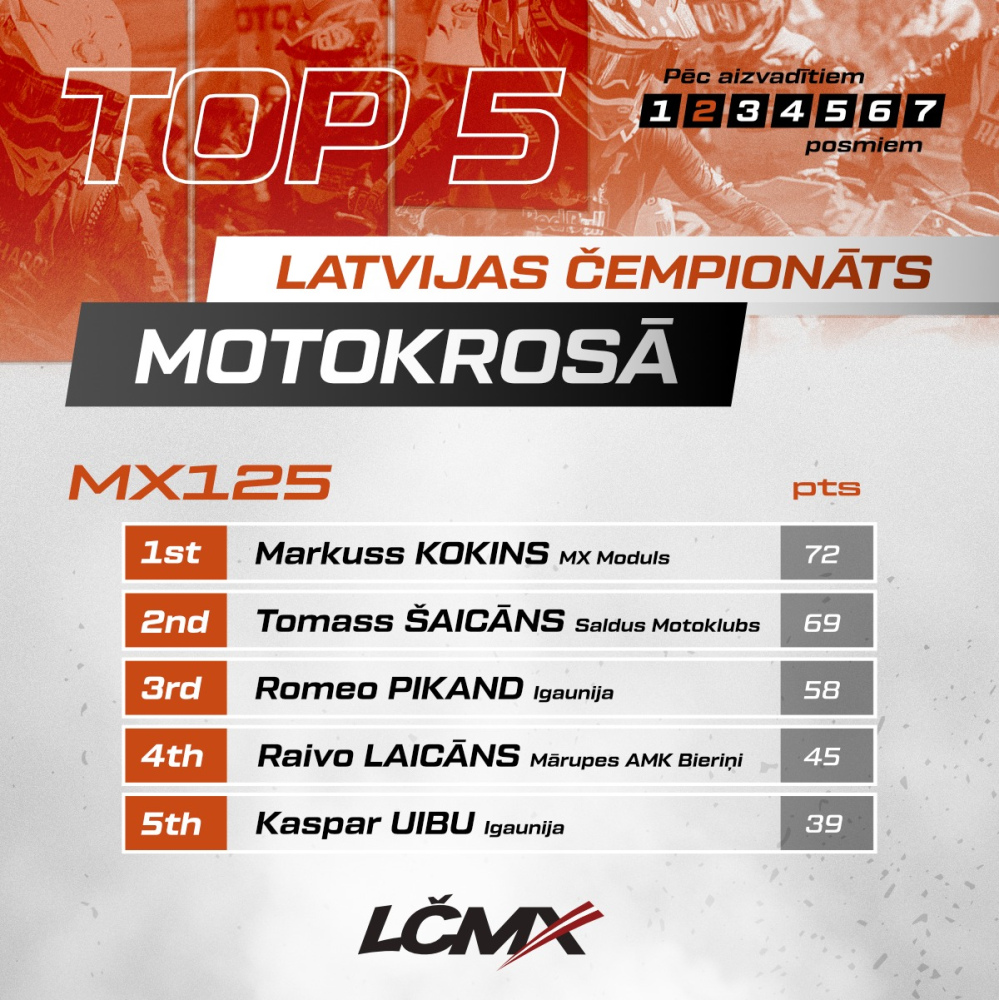 Sacensību karstumā vienā no epizodēm tukumnieku apdzina Tomass Šaicāns, bet drīz vien Markusam izdevās atgūt līderpozīciju, kuru gan vēlāk atkal zaudēja. Finišā Markuss Kokins iebrauca kā otrais, bet sezonas kopvērtējumā pēc aizvadītiem diviem posmiem Tukuma mostosportists ir Latvijas čempionāta līderis 125cc klasē.