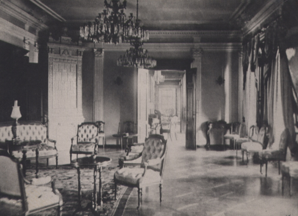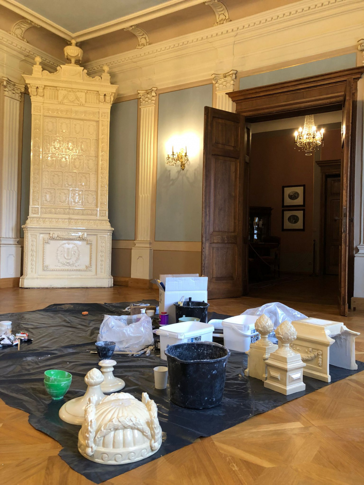 Luija XVI stila iespaidā darinātās, no krēmkrāsā glazētiem reljefiem podiņiem būvētās krāsnis līdz mūsu dienām bija nonākušās kopumā labā stāvoklī, taču padomju laikā abas bija zaudējušas dekoratīvo noslēgumu – sarežģītu kompozīciju ar “ananāsa” formas “vāzītēm”, volūtveida pārejas elementiem un centrā novietotu klasiskas formas urnu uz festona rotātas pamatnes. Krāsnis bez noslēdzošās augšdaļas radīja nepilnīgu, pat deformētu priekšstatu par to sākotnējo izskatu, kas būtiski pazemināja arī pils zāles interjera kopējo māksliniecisko līmeni.