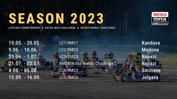 Sezona sastāvēs no pieciem posmiem, kas visi notiks piecās dažādās Latvijas trasēs. Tāpat Latvijā tiks aizvadītas arī vienas "Rotax Nordic Challenge" sacensības, kas vienlaikus kalpos kā papildus "Rotax Max Challenge" ieskaites posms.