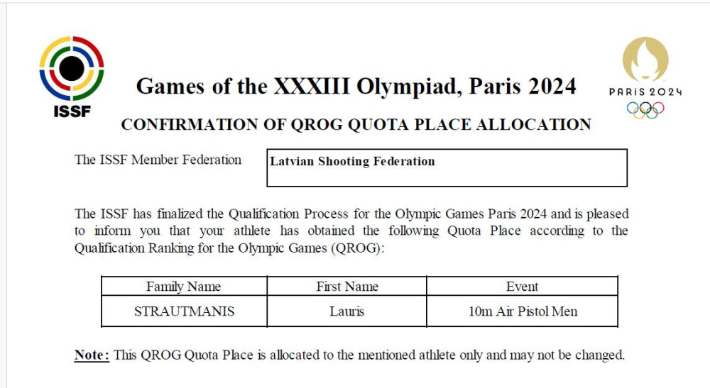 Kopš 2000. gada Sidnejas olimpiskajām spēlēm Latvijas šaušanas sportu olimpiskajās spēlēs atkal pārstāvēs 2 sportisti. Jau ziņots, ka Agate Rašmane jau pērn pasaules čempionātā izcīnīja tiesības startēt Parīzes olimpiskajās spēlēs.