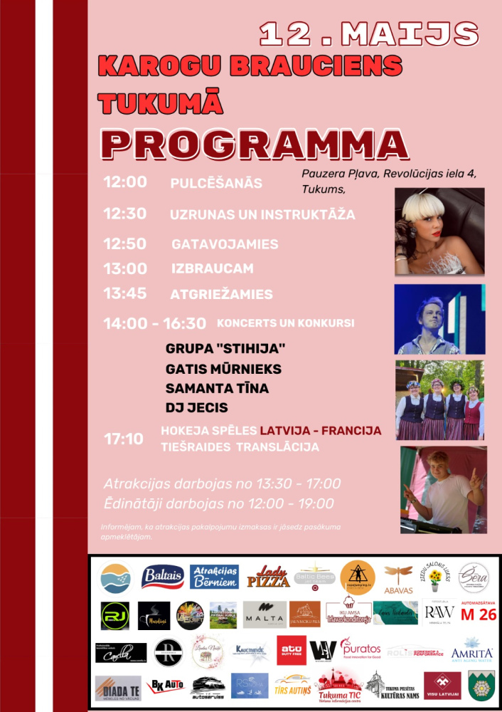 12.maijā visā Latvijā notiek akcija "Latvijas karogu brauciens" . Karogu brauciena mērķis ir atgādināt, ka arī šodien iespējama latviešu tautas vienotība. Pasākums Tukumā norisināsies - 12.maijā, ar tikšanās vietu laiku pulksten 12:00 Pauzera pļavās. Par brauciena maršrutu vairāk uzzināt var Facebook lapā: KarogubrauciensTukuma. Pēc brauciena būs arī koncerts, kurā uzstāsies Samanta Tīna, Gatis Mūrnieks, meiteņu grupa “Stihija”. Būs arī aktivitātes gan bērniem, gan pieaugušajiem.