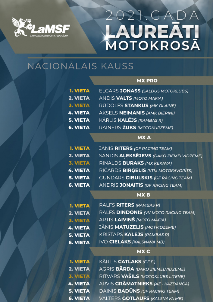 Valstī izsludināto epidemioloģisko ierobežojumu dēļ šogad nenotiks Latvijas Nacionālā kausa motokrosā, tāpēc Latvijas motokrosa čempionāta laureāti savus apbalvojumus saņems ar Omniva kurjera starpniecību.