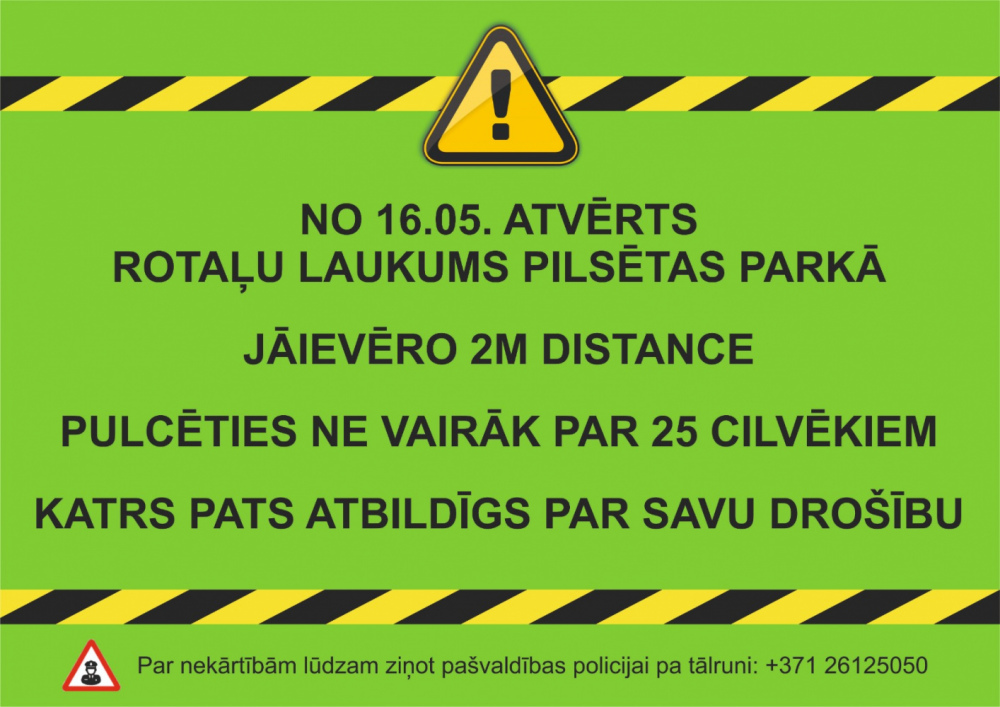 No rītdienas, 16.maija, Tukuma pilsētas parkā tiks atvērts publiskais rotaļu laukums. Rotaļu laukumā, ievērojot Ministru Kabineta (MK) 103. noteikumus, būs starp cilvēkiem jāievēro 2 m distance un tajā vienlaicīgi nedrīkstēs pulcēties vairāk par 25 apmeklētājiem.
