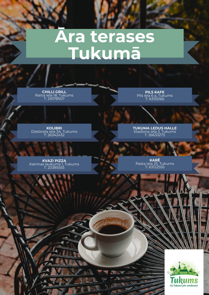 Āra tersases Tukumā jau ar rītdienu gatavas nodrošināt tādas ēdināšanas iestādes kā Chili Grill (Raiņa ielā 18), Pils Kafe (Pils ielā 6a), Kolibri (Dzelzsceļa ielā 3a), Kvazzi Pizza (Katrīnas laukumā 1), Tukuma ledus halle (Stadiona ielā 3) un Karē (Pasta ielā 25). Visticamāk, drīzumā savu terasi varētu apmeklētājiem atklāt Terase Kafe (Brīvības laukumā 11) un citas pilsētas iecienītākās kafejnīcas.