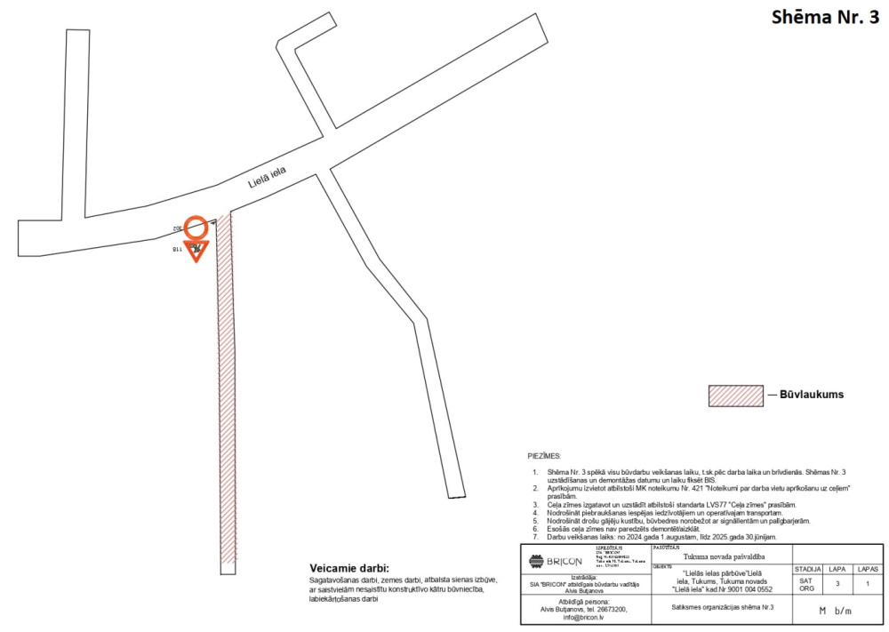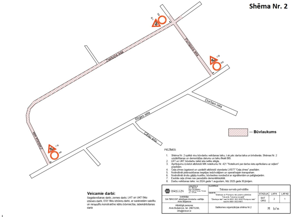 Saistībā ar plānotajiem būvdarbiem, informējam, ka braukšanas kustība tiks organizēta atbilstoši uzstādītajām ceļa zīmēm kā norādīts satiksmes organizācijas shēmās.