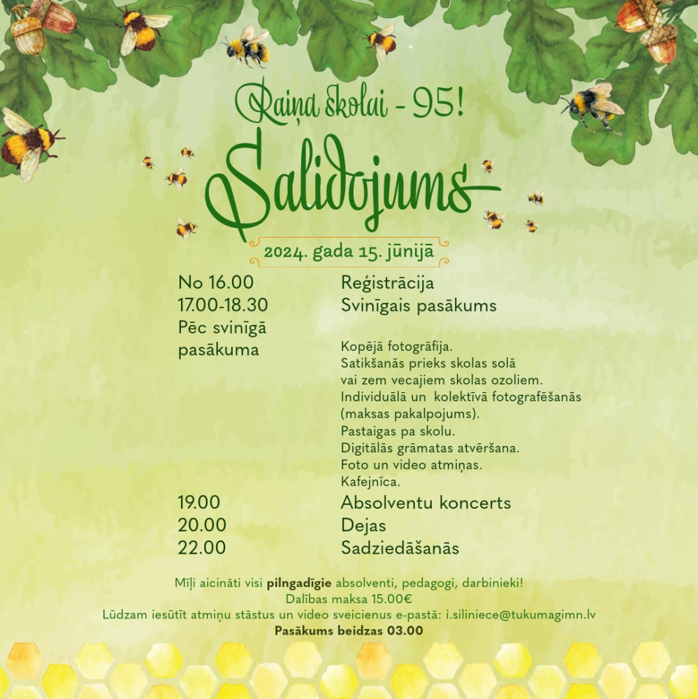 Šis gads Tukuma Raiņa ģimnāzijai ir īpašs, jo skola svin savu 95 pastāvēšanas gadadienu. Šis nozīmīgais notikums ir iespēja atkalredzēties, dalīties atmiņās un atskatīties uz skolas bagāto vēsturi, kas kopš 1927. gada ir veidojusies ar rūpību un apņēmību.