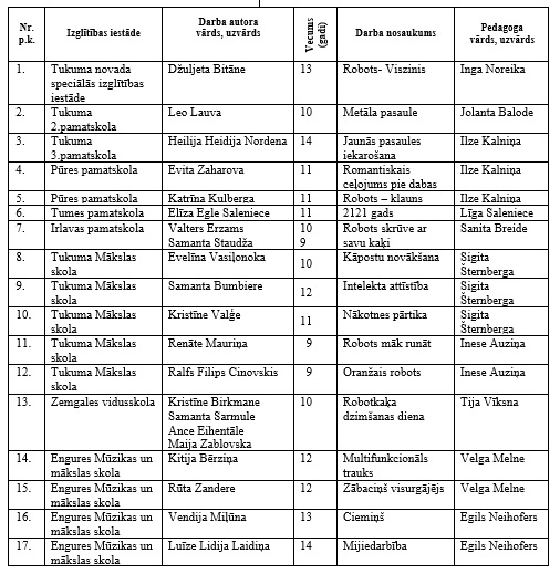 Konkursa darbus vērtēja žūrijas komisija: I. Rimicāne (komisijas priekšsēdētaja); I.L. Lazdiņa, M. Avota, D. Timule (žūrijas komisijas locekles); S. Vancāne (tehniskā sekretāre). Žūrija tālāk konkursam Čehijā virzījuši: Džuljetu Bitāni (Tukuma speciālās skolas iestāde), Leo Lauvu (Tukuma 2. pamatskola), Heiliju Heidiju Nordenu (Tukuma 3. pamatskola), Evitu Zaharavo (Pūres pamatskola), Katrīnu Kulbergu (Pūres pamatskola), Elīzu Egli Salenieci (Tumes pamatskola), Valteru Erzemu/Samantu Staudžu (Irlavas pamatskola), Evelīnu Vasiļonoku (Tukuma mākslas skola), Samantu Bumbieri (Tukuma mākslas skola), Kristīni Vaļģi (Tukuma mākslas skola), Renāti Mauriņu (Tukuma mākslas skola), Ralfu Filipu Cinovski (Tukuma mākslas skola), Kristīni Birkmani/Samantu Sarmuli/Anci Eihentālu/Maiju Zablovsku (Zemgales vidusskola), Kitiju Bērziņu (Engures novada mūzikas un mākslas skola), Rūtu Zanderi (Engures novada mūzikas un mākslas skola), Vendiju Miļūnu (Engures novada mūzikas un mākslas skola) un Luīzi Lidiju Laidiņu (Engures novada mūzikas un mākslas skola).
