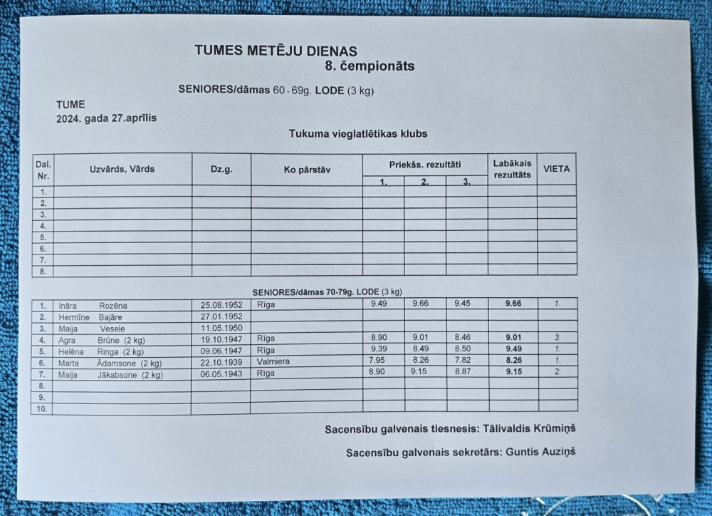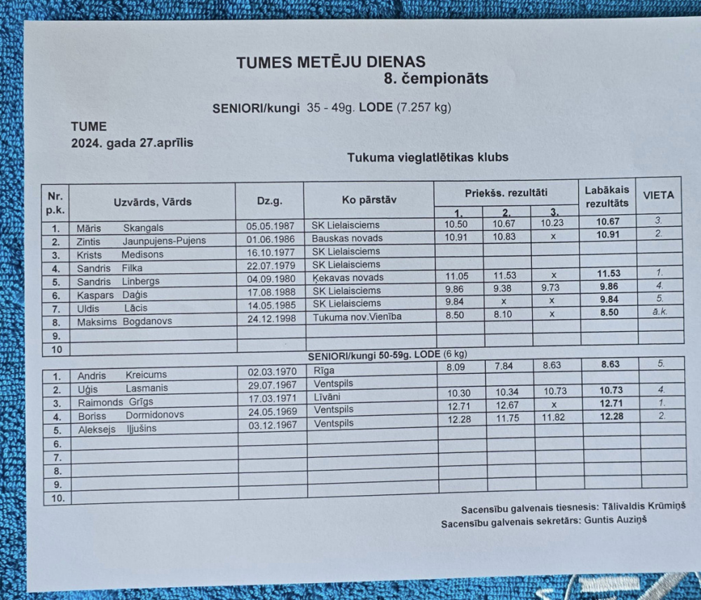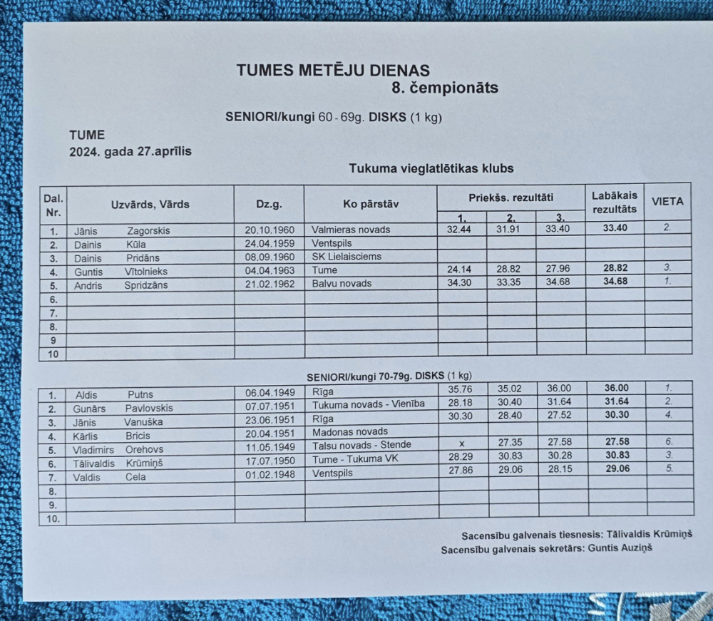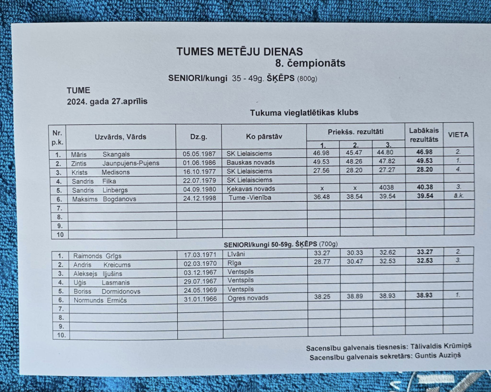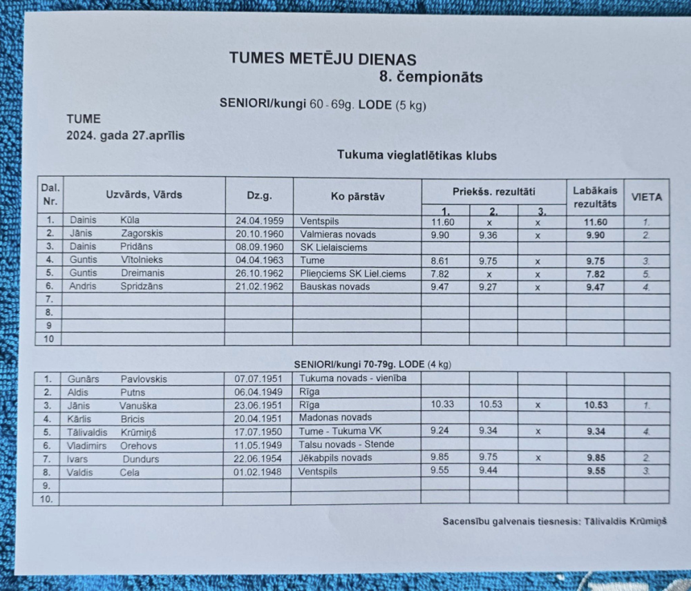 27.aprīlī Tukuma novada Tumē astoto reizi notika veterānu un senioru čempionāts šķēpa mešanā, diska mešanā un lodes grūšanā “Metēju diena 2024".