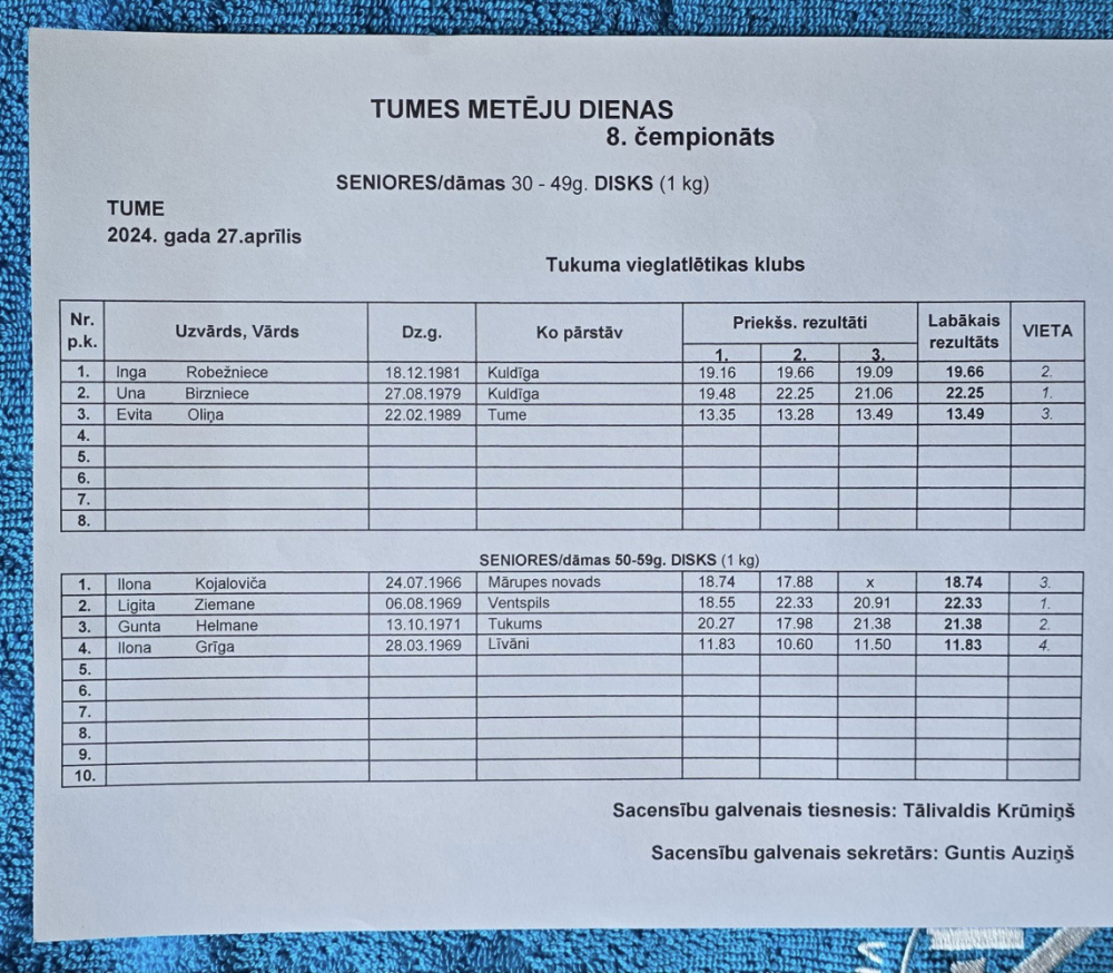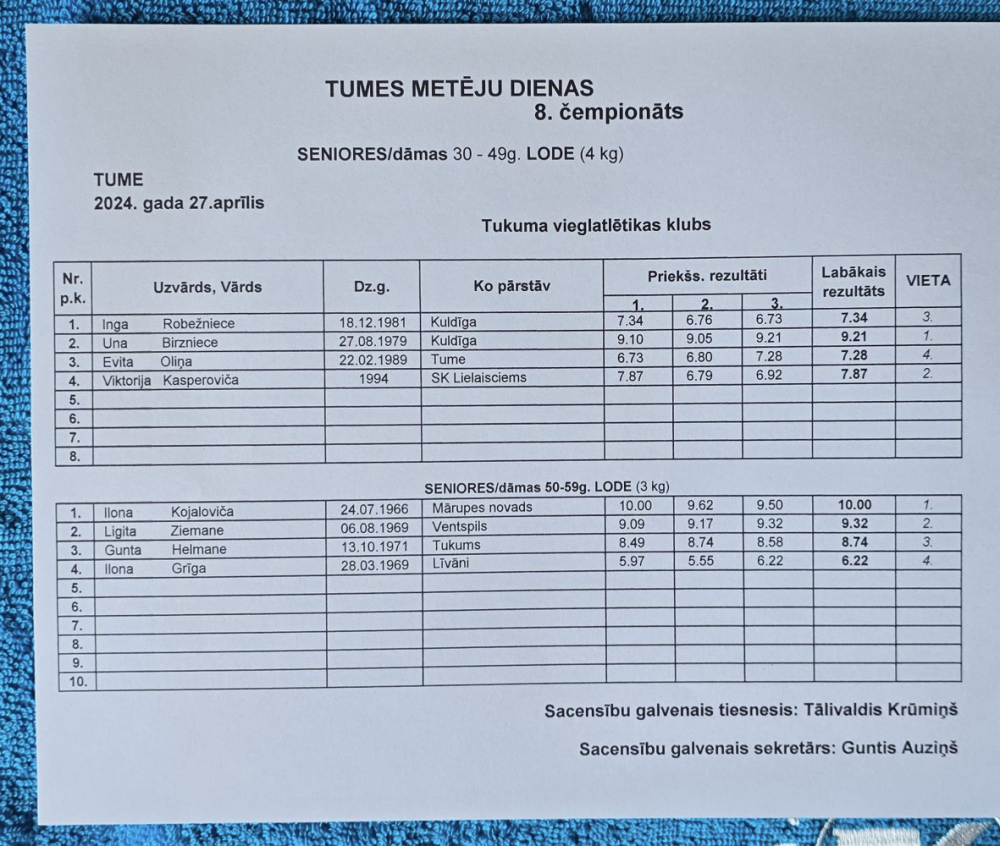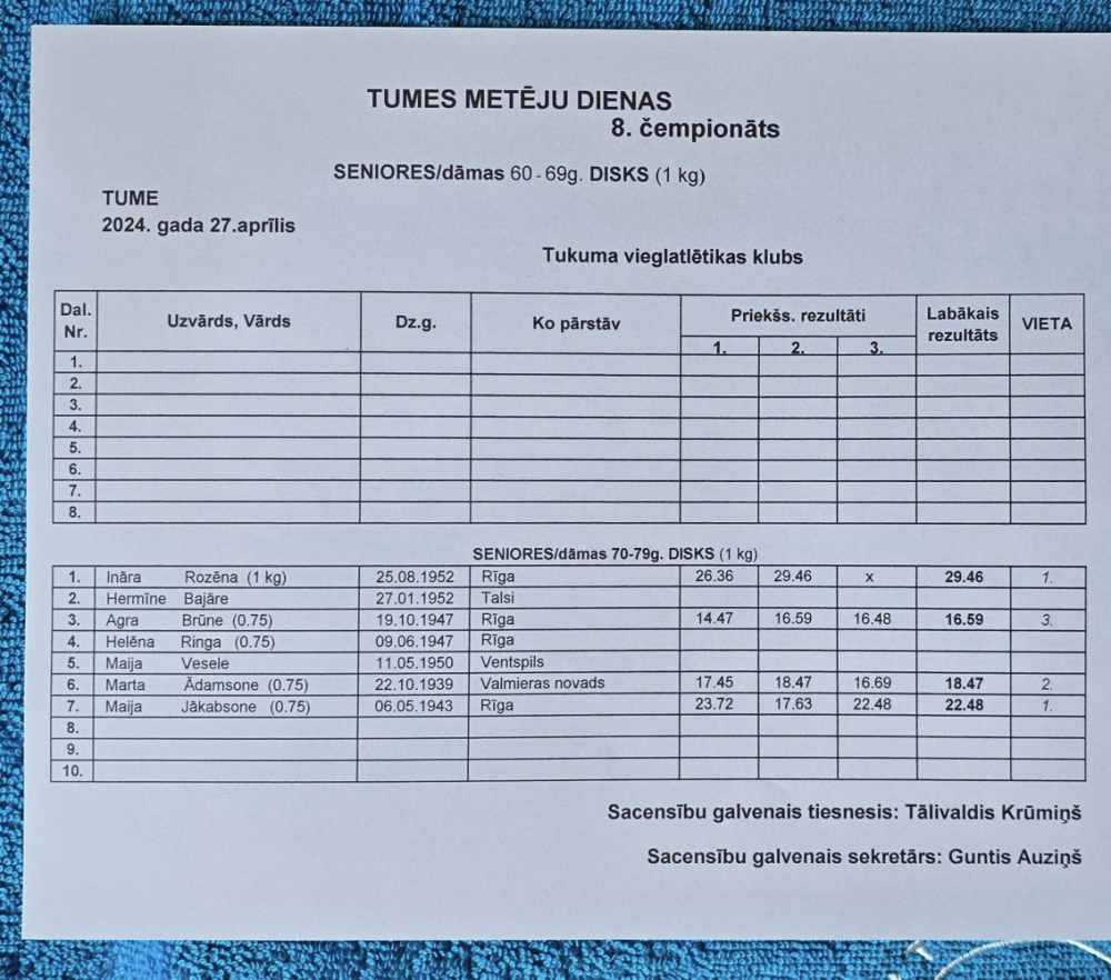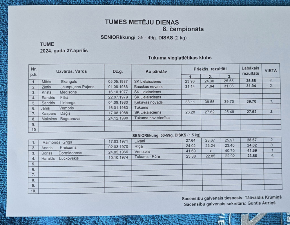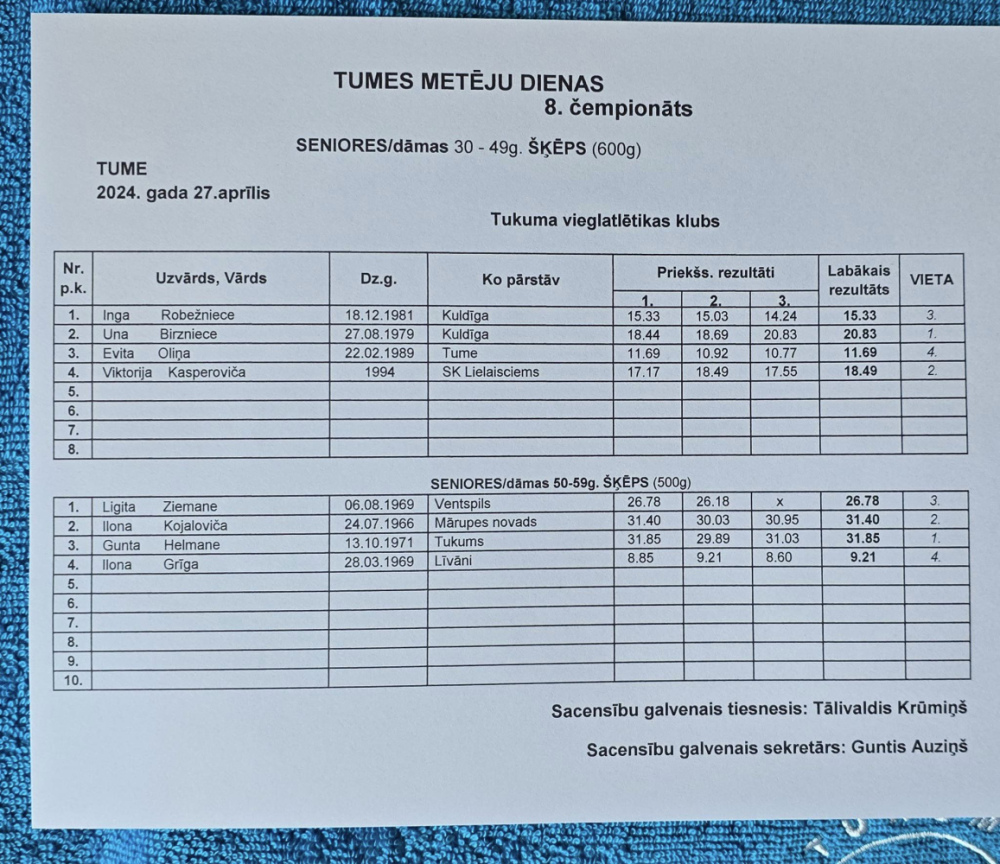 27.aprīlī Tukuma novada Tumē astoto reizi notika veterānu un senioru čempionāts šķēpa mešanā, diska mešanā un lodes grūšanā “Metēju diena 2024".