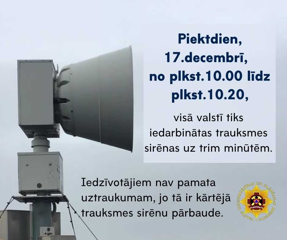 17.decembrī no pulksten 10 līdz 10.20 visā valstī tiks iedarbinātas trauksmes sirēnas uz trim minūtēm. Iedzīvotājiem nav pamata uztraukumam, jo tā ir kārtējā trauksmes sirēnu pārbaude. Gadījumā, ja trauksmes sirēnu pārbaudes laikā tās nedzirdat, nesatraucieties, jo ārkārtas gadījumos, kur sirēnas nav dzirdamas vai izvietotas, var tikt izmantoti citi apziņošanas veidi, piemēram, informācijas nodošana sabiedrībai caur operatīvo dienestu un to sadarbības partneru skaļruņiem. VUGD aicina viesnīcu administrāciju informēt savus ārvalstu viesus par gaidāmo trauksmes sirēnu pārbaudi, lai nerastos lieki uztraukumi.