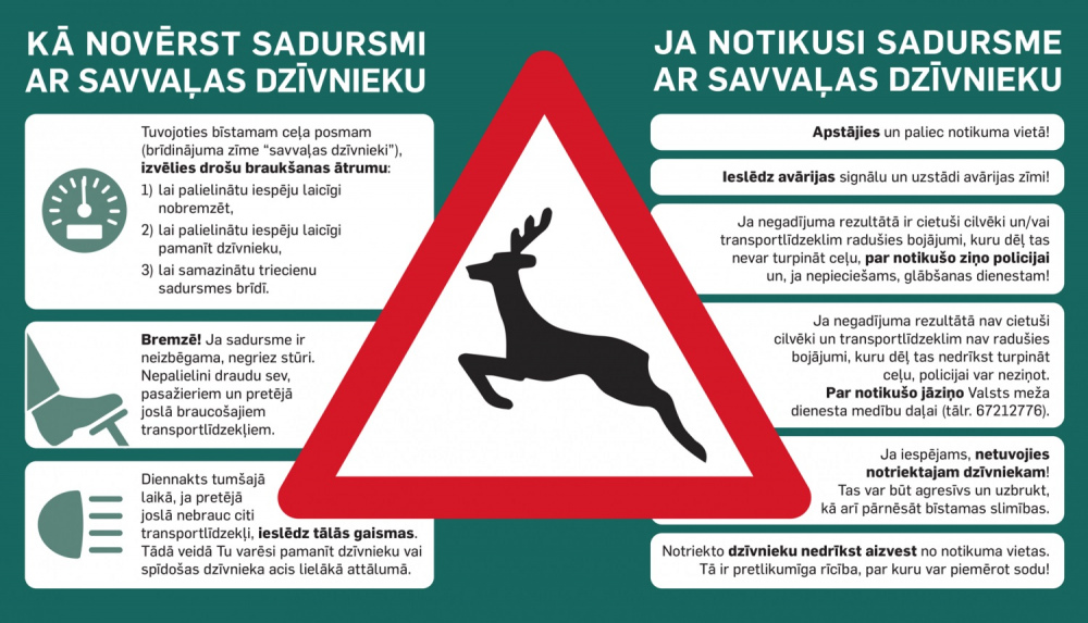 Lai izvairītos no iespējama ceļu satiksmes negadījuma, aicinām būt īpaši vērīgiem un piesardzīgiem, izvēlēties drošu braukšanas ātrumu, kā arī ievērot ceļa zīmes, kas norāda par iespējamu meža dzīvnieku klātbūtni.