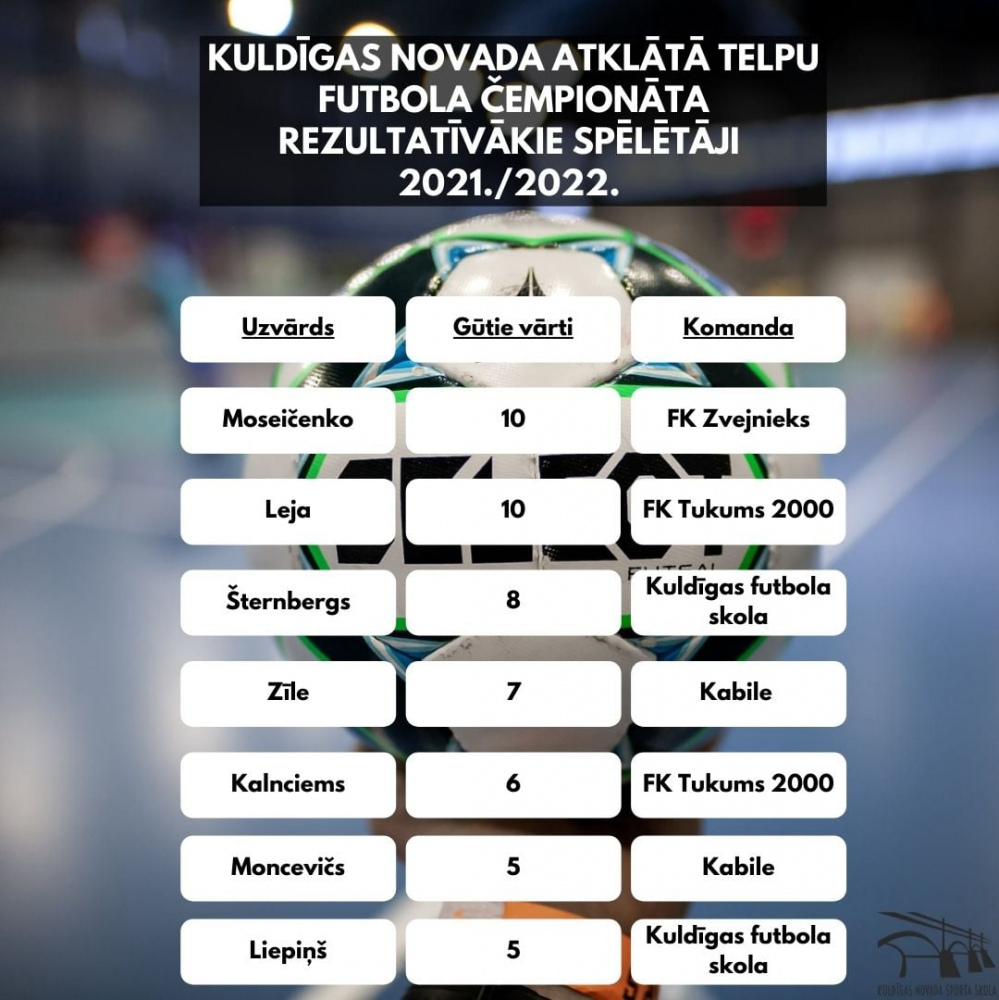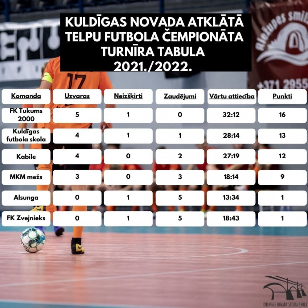 Aizvadītajā nedēļas nogalē tika aizvadītas divas cīņas Kuldīgas novada atklātajā telpu futbola čempionātā. Divas uzvaras guva FK „Tukums 2000” komanda, kas pieveica „MKM mežs” un Alsungas vienības.