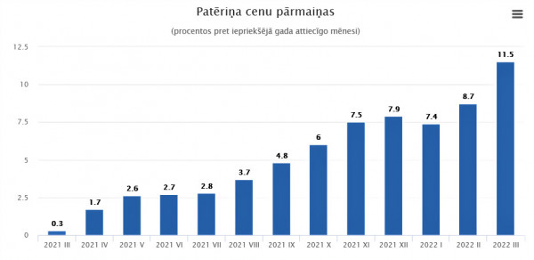2022. gada martā, salīdzinot ar 2021. gada martu, vidējais patēriņa cenu līmenis palielinājās par 11,5%, liecina jaunākie Centrālās statistikas pārvaldes dati.