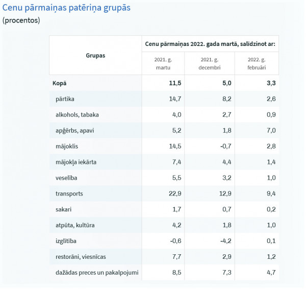 Vidējais patēriņa cenu līmenis mēneša laikā palielinājās par 3%. Visstraujākais cenu kāpums bijis sālij un garšvielām (+10,5%), augu eļļai (+8,0%), kafijai (+6,6%), liellopu gaļai (+5,4%) saldējumam (+5,3%). Apģērbu un apavu vidējais cenu līmenis martā pieauga par 7,0%. Ar mājokli saistītām precēm un pakalpojumiem vidējais cenu līmenis palielinājās par 2,8%. Sadārdzinājās elektroenerģija, cietais kurināmais, siltumenerģija, kā arī materiāli mājokļa uzturēšanai un remontam. Ar transportu saistītās preces un pakalpojumi kļuva dārgāki par 9,4%, ko galvenokārt noteica degvielas cenu kāpums par 17,1%. Dīzeļdegvielas cenas palielinājās par 20,3%, benzīna - par 15,0%, un auto gāzes - par 2,5%. Dārgāki bija pasažieru aviopārvadājumi, rezerves daļas un piederumi personiskajiem transportlīdzekļiem.